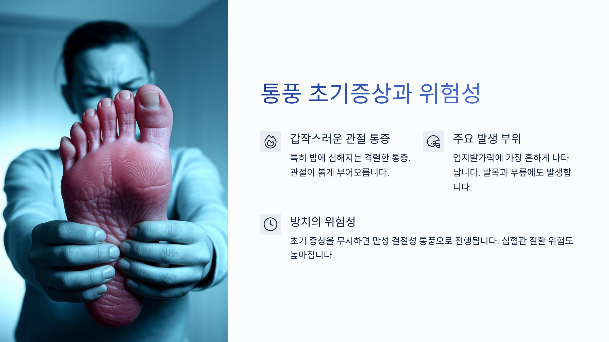 | 급성 관절통 | 밤에 심해지는 엄지발가락 통증은 통풍의 핵심 증상 |