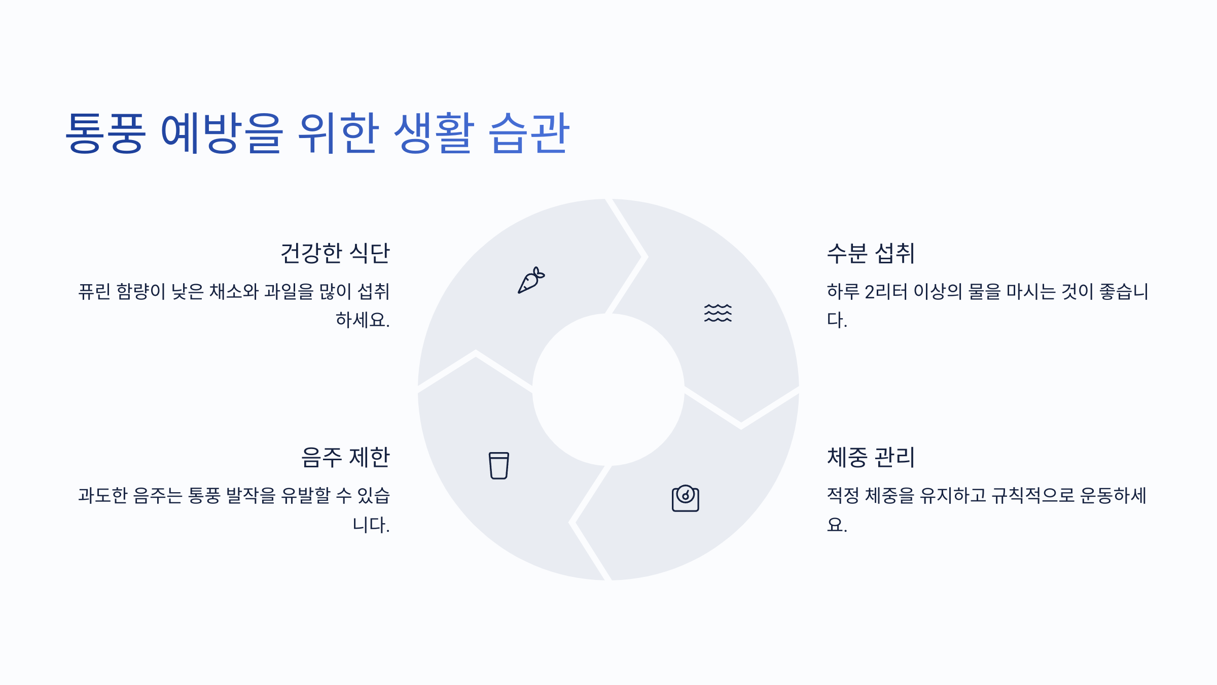 | 음주 및 당류 제한 | 맥주와 탄산음료 섭취 최소화 |