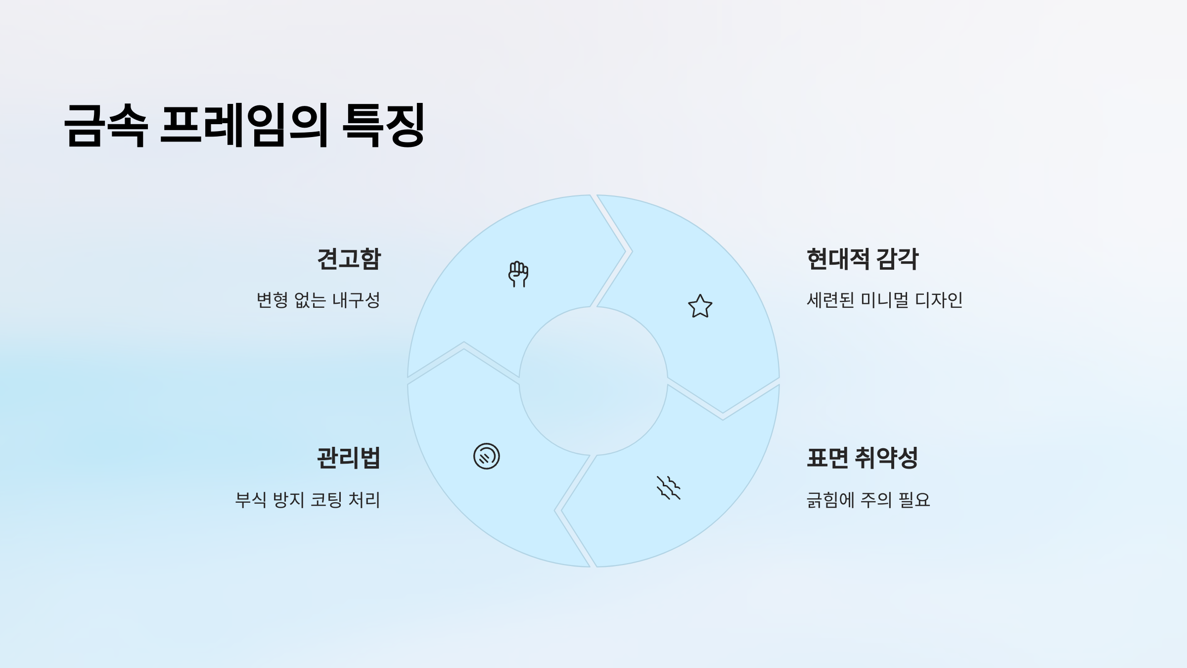 | 금속 프레임 | 세련된 디자인, 내구성 우수, 부식 가능성 있음 |