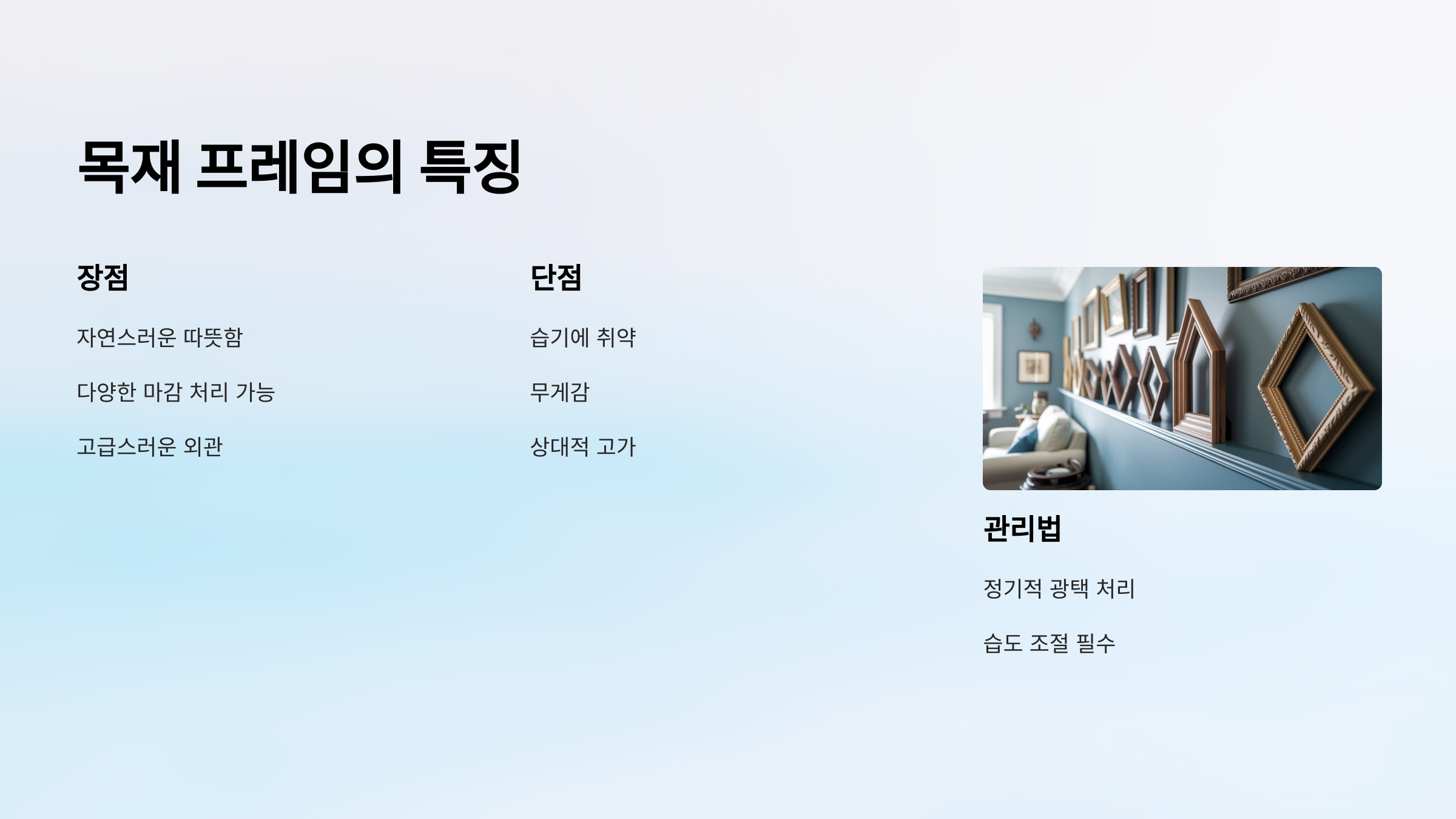 | 목재 프레임 | 고급스러우며 따뜻한 분위기, 내구성 높음, 습기에 취약 |