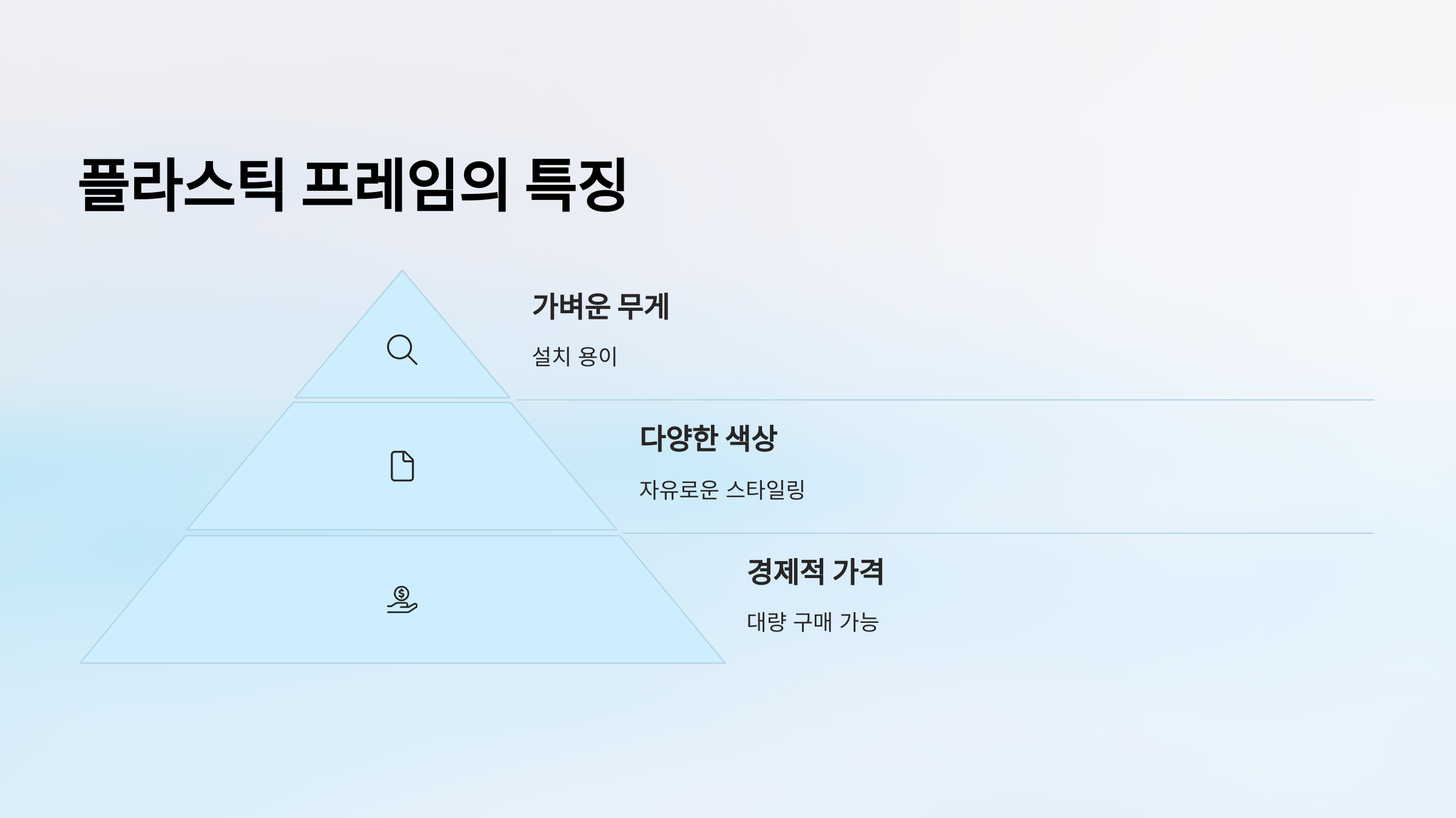 플라스틱 프레임은 가벼우면서도 다양한 디자인과 색상을 선택할 수 있어 활용도가 높습니다. 습기나 부식에 강하기 때문에 욕실이나 주방 같은 습한 공간에서도 사용할 수 있습니다. 하지만 내구성이 금속이나 목재보다 낮아 충격에 약하고, 시간이 지나면 변색될 수 있는 단점이 있습니다.