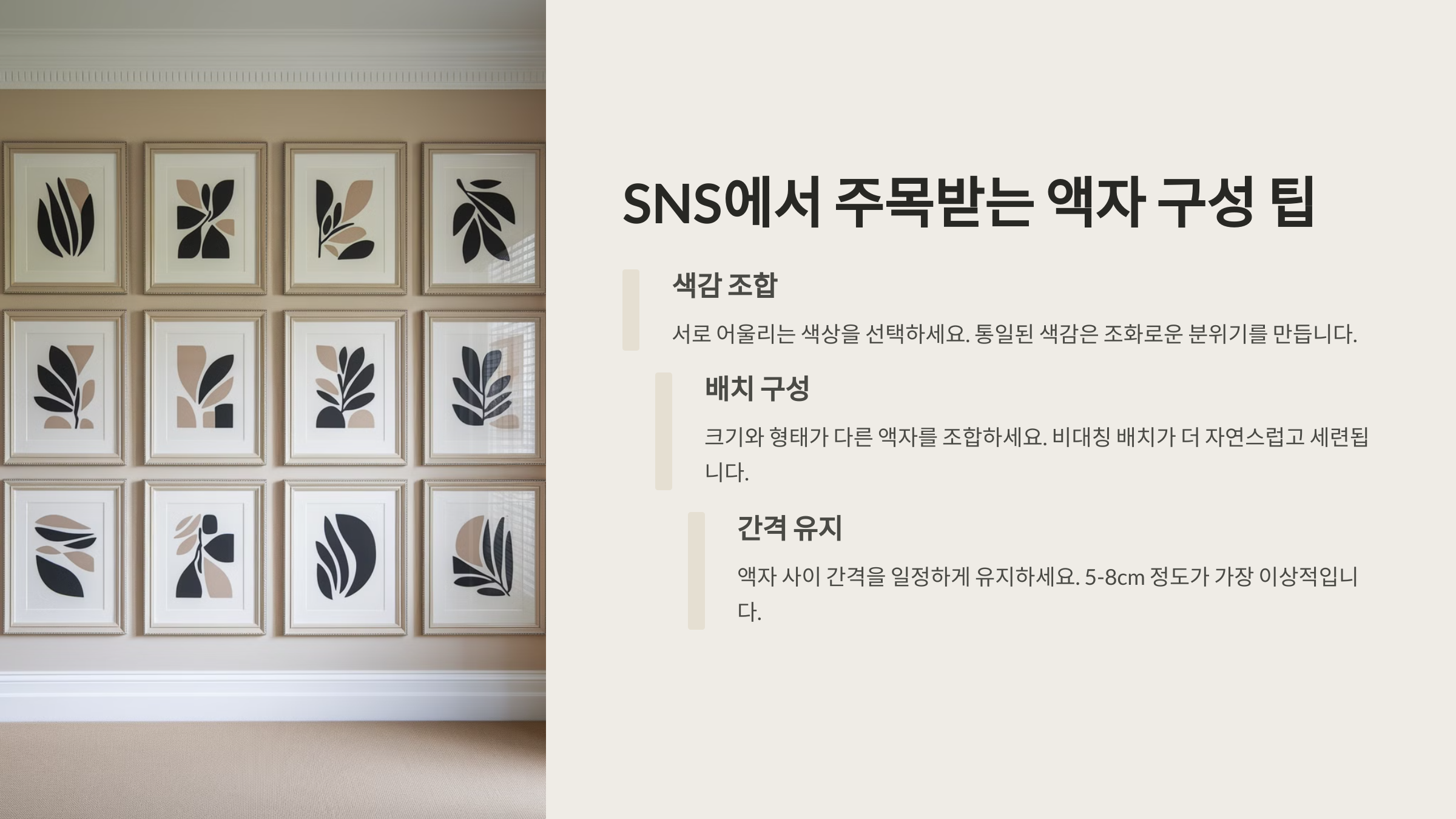 | 액자 크기 조합 | A3 이상의 대형 액자 + 작은 액자 조합으로 다채로운 느낌 |